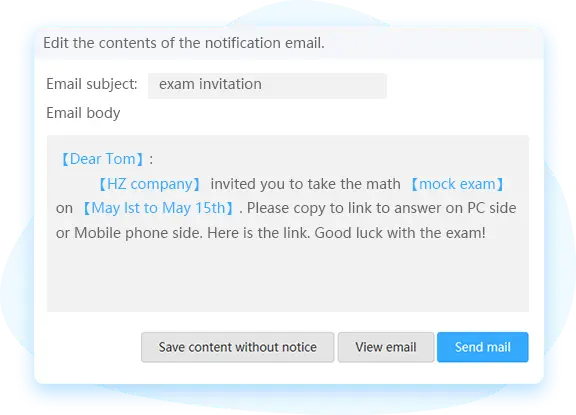 Edit the information you want to show to your candidates. You can easily add your company name, website link, and slogan to the exam invitation message to deliver a unique experience to candidates.