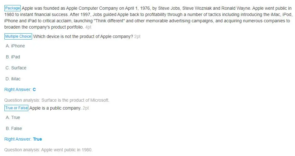 OnlineExamMaker is all-in-one online exam software to help exam administrators to assess exam tankers in a variety of ways, it provides up to 10 question types, including (1)Multiple choice, (2)Multiple responses, (3)Fill in the blank, (4)True or false, (5)Essay, (6)Matching, (7)Sorting, (8)Cloze, (9)Comprehension, (10)Indefinite item. You can use them to collect answers from a host of candidates, such as students, employees, training participants, friends, customers and more.