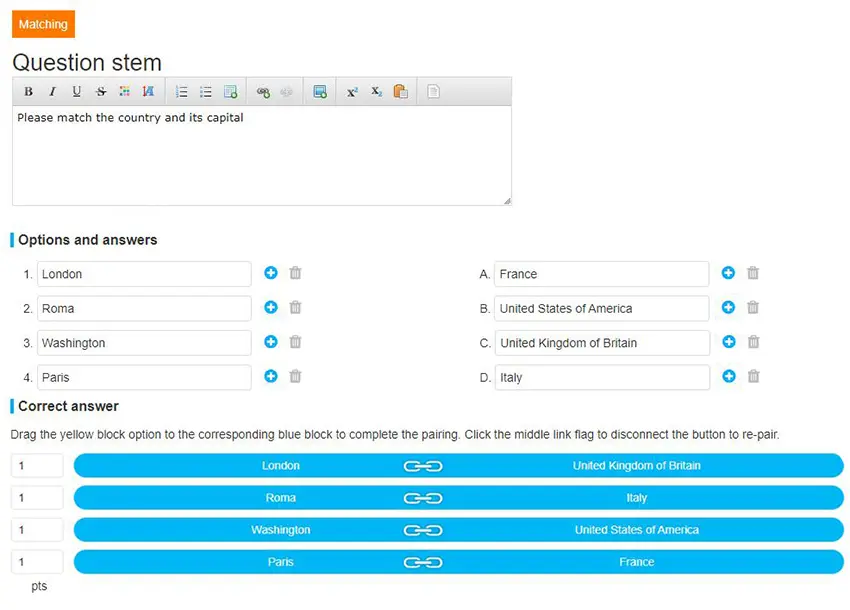 For matching questions, exam takers are asked to match together pairs of questions and answers.